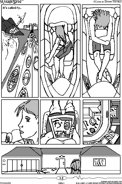 Posted by Trimble on August 31,2004 As one would expect, the deity would come to be known by some name and so I ran through a bunch of single syllable constructs in an attempt to get a name which can convey power and not be problematic. I finally came to Fy as a name and then put the scene in panel 1 to show just how Fy is a self-evident phenomena in the MetaVerse. I'll develop Fy further through Kim's analysis of texts on Fy that she and her husband desperately need to understand. They were shocked at this fact when they arrived but had to get over it to survive in a new land. Let me explain some of this page. The West Coast was developed for efficiency and keeping land pristine and/or fertile. Many areas are developed along the lines of dedicated business centers and outlying housing areas to keep down sprawl and minimize resource needs. They are connected by high-speed roads traveled by automated vehicles which drastically cut commute and other related problems. Kim has just picked up an eBook loaded with a history of Fy's major interventions inluding a nuke containment pictured on the cover. Kim returns to her 'home' in the shaded clover seen on page 1. This home was provided to the couple because of their combined professions but the exact mechanism lies in the three months I have yet to develop. Hopefully you can empathize with Kim as she turns in her seat to see and then process seeing a manifestation of Fy far closer than she ever has before. But now we join her at 'home'. |